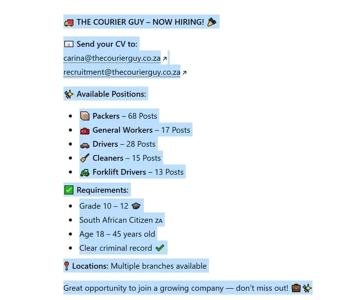 At The Courier Guy Jobs South Africa, we connect job seekers with the latest recruitment updates, career development programs, and secure online application options from trusted employers. Whether you’re searching for government jobs, private company positions, or urgent hiring opportunities, our portal helps you apply confidently and take the next step in your professional journey.